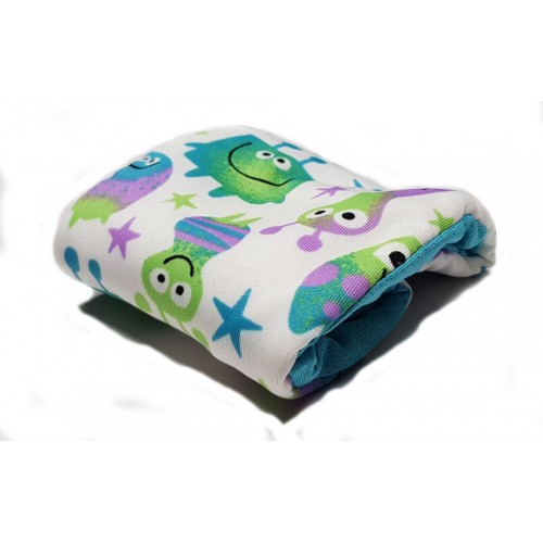 | Materiaalit | Pintakerros pehmeä hengittävä ja vedenpitävä kosteussulkukangas. Välikerros: puuvillafrotee. Sisäkerros: kevyt onteloneulos. Sivuissa on kuminauhakiristys. Kiinnitys tarranauhalla. |